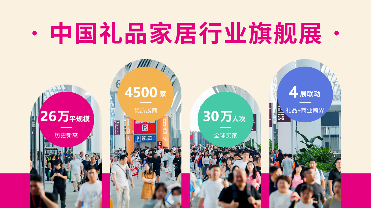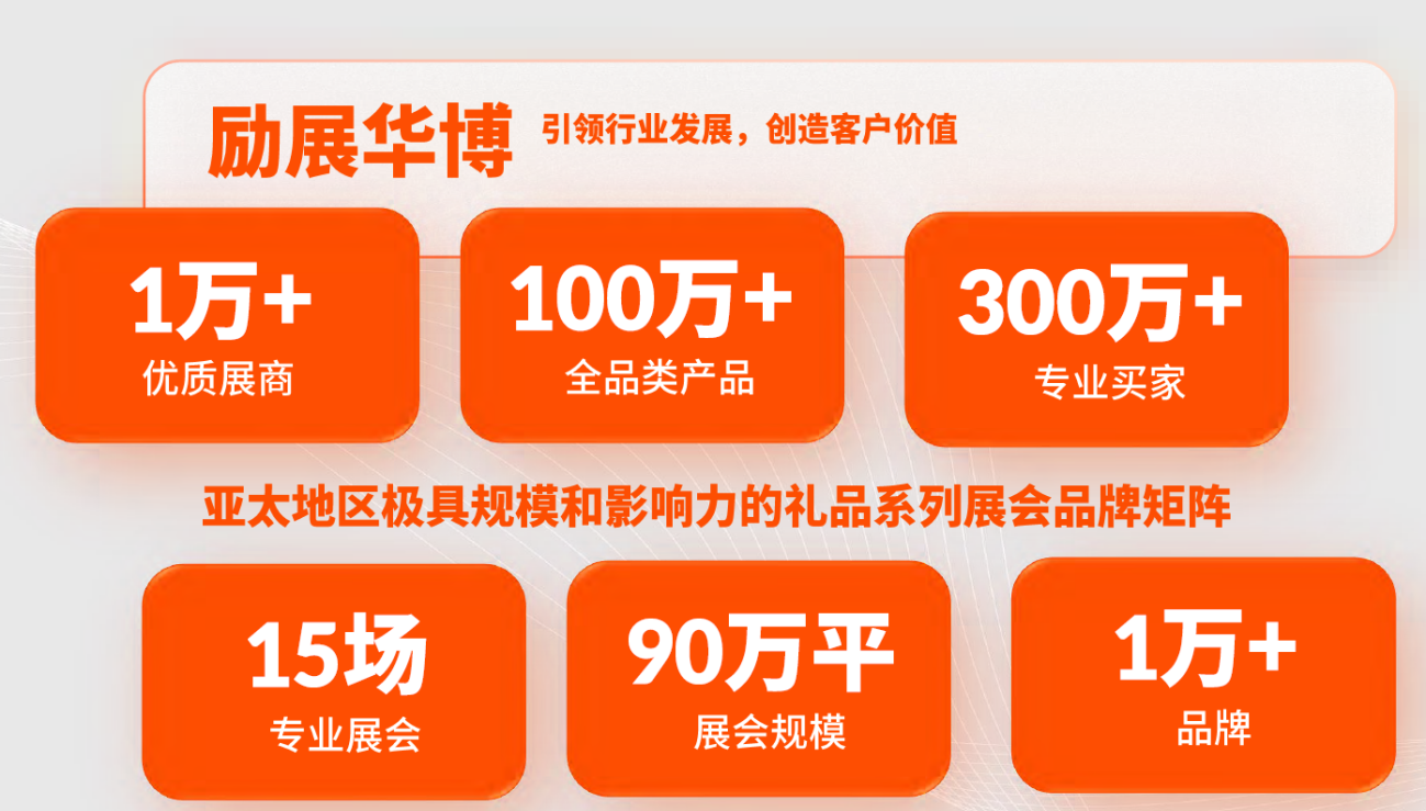 励展华博每年举办15场专业B2B展会,布局覆盖华南、华北、华东、西南6大经济枢纽城市。展会汇聚逾10000家全品类、高质量展商,更有知名品牌、源头工厂强势加入。 100万前沿产品,多场景满足300万买家采购需求,品质化引领消费新风向,已逐渐形成亚太地区极具规模和影响力的礼品系列展会品牌矩阵。