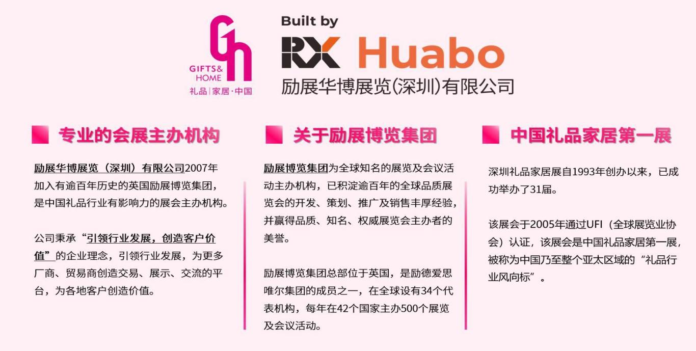 励展华博展览(深圳)有限公司是中国礼品家居行业领先的展会主办机构, 也是英国励展博览集团(国际领先的展览及会议主办机构)的成员公司。 公司旗下的礼品及家居展会系列是国内规模庞大也是广受赞誉的展会品牌之一。